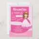 Cute girls 5th birthday invitation featuring a pretty brunette princess on a large pink number with pink and white polka dot background.