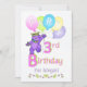 3rd birthday party custom name invitation featuring a cuddly and cute purple teddy bear princess dressed up in a lovely yellow jewelled crown and pink, blue and green flower accessories holding a bunch of balloons with the word PARTY on them. Personalising with child's name makes it extra special. Original design by Anura Design Studio.