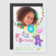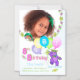 8th birthday party magnetic keepsake photo invitation with custom name featuring a cuddly smiling purple teddy bear princess dressed up in a lovely yellow jewelled crown and pink, blue, yellow and green flower accessories holding a bunch of balloons with the word PARTY on them. Personalising with child's photo and name makes it extra special. Save the date magnet is a fun reminder on the refrigerator. Original design by Anura Design Studio.
