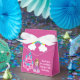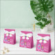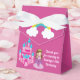 A pretty personalised princess birthday party favour box featuring a beautiful little girl in a queen ball gown with pink bows standing in front of a pink and ice blue castle on a hot pink background. A cute custom party gift for a little girl.