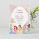 A pastel-themed invitation for a 6th birthday tea party featuring illustrations of princesses in elegant gowns. The soft pink backdrop and floral accents add a whimsical, celebratory tone. Event details are elegantly printed in cursive above the princesses. The back of the invitation is light pink. Keywords: birthday, party, princess, invitation, tea party, celebration