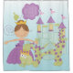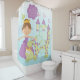 A cute, fun, girly shower curtain your little princess will love, features a brown haired little princess, castle, frog prince, and a polka dotted dragon!