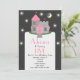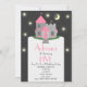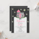 A birthday party invitation for a girl featuring an illustration of a pink and grey princess castle surrounded by the moon and stars over a dark grey background. Personalise with details of your occasion.