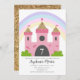 Fun kid's princess theme birthday party invitation template card featuring a pink castle with faux gold glitter tops. There is a pastel colour rainbow in the background. Great for a girl's royal party.