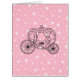 A picture in black of a pretty fairy tale coach for a princess. A whimsical fastasy design of a fairytale carriage. The background is a nice pattern of stars in pastel pink.