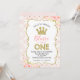 Sweet princess crown 1st birthday invitation in pink and gold? A cute way to invite your little one's guests to her party. The design features a large faux gold glitter word, two pink watercolor floral arrangements, a frame and a faux gold glitter polka dot pattern. The background is an off white and faint pink striped pattern. Same design is also available with a photo at the store. This girl's princess crown 1st birthday invitation is ready to be personalized.