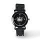 Pretty girly wrist watch with graphics of a silver tone and white crown, on a black background decorating the face of the watch. Graphics of diamond like rhinestones represent the hours 12, 3, 6, and 9 O'clock. Personalise the fancy white text, under the crown, for yourself or as a great gift idea.