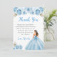 This Quinceanera thank you card features a beautiful princess in a blue ball gown with floral arrangements. This is perfect for a Quinceanera birthday party.