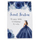 This sweet sixteen birthday gift bag features a beautiful princess in a navy blue ball gown with floral arrangements. This is perfect for a sweet sixteen birthday party.