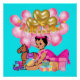 Illustration of an adorable baby girl dressed in pink, with hair in buns with pink bows and princess tiara. Surrounded by toys and with pink and gold balloons above with stars and moon banner. Cute gift for expecting parents, baby shower, gender reveal, or baby birthday gift.
