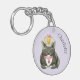 Cute cat lovers key chain done in lavender with watercolor artwork of a tuxedo cat smiling and wearing jewels and a crown. Personalise the black text to read what you want.