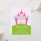 Princess party birthday invitation featuring a princess castle on a green, grassy hill with the party details written on the grass.