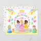 A princess theme Kid Children Birthday Party Invitation. On a white background, princesses in blue, purple, pink, yellow and green dresses are seen surrounding a podium with flowers, balloons, cake and presents. The typography text reads Your Child's Name Princess Party, with a decorative crown on top. The child's age is written on two clouds flanked by rainbows. Personalize by adding your full event and contact details.