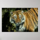 A portrait image of a magnificent male Malayan Tiger (Panthera tigris jacksoni). This beautiful orange and black-striped feline is standing in bright sunlight against a dark green backdrop of jungle plants. The cat is gazing intently off to the viewers right.