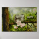 Oil painting Baby Owls. Print for sale. Pink flowers owls in tree.