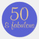 This modern "50and fabulous" birthday sticker is printed in blue and gold ink. The text uses elegant typography in complimentary blue and gold ink.