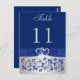 This royal blue and silver grey floral table number postcard has a PRINTED ribbon and bow and a pair of PRINTED diamond jewel and FAUX glitter (simulated) joined hearts on it that matches the wedding invitations shown below. ****You MUST change the number 11 to each number that you need, add it to your cart, and then come back and repeat the process with each number that you need. Quantity discounts may apply once you add all the items to your cart. If you have any questions, email niteowlstudio@gmail.com.