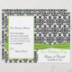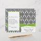 This black and white damask wedding program or order of service has a chartreuse green PRINTED ribbon on it, along with a PRINTED diamond jewels buckle on it that matches the wedding invitation shown below. If you need assistance getting your information to fit or to align properly, please email niteowlstudio@gmail.com. Your document will print out as it appears on your monitor. It will NOT be edited for typos or alignment etc. by Zazzle. ****PLEASE NOTE that the higher grade paper is a card stock and does not fold well (cracks the design along the fold, even if you pre-score it with a sharp edge).