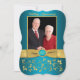 This elegant teal blue green and gold floral with scrolls Sixty-fifth wedding anniversary photo invitation has a PRINTED gold ribbon and bow with a PRINTED FAUX engraved look teal and gold medallion on it. It has a template area for you to upload your own digital photo to. You can remove the stylised cursive "Wedding Anniversary" or "60th" text. All the text is customisable, and so are the paper choices. ****PLEASE NOTE that the gold paper is a very dark brassy gold and it will alter the colours of the design (turn the photo gold etc.), so I do NOT suggest using that paper. Felt paper will also alter the colour of your photo slightly. This invitation is designed to fit the 5x7 size curved SHAPE card. If you change to another size/shape, the design will no longer fit properly, so if you want a different size, please contact me so I can re-design it for you. ALSO, if you change fonts or font sizes, your text may not fit properly any more. Zazzle will not edit anything for typos, alignment, or anything else, and I will not see your invitation. Everything will print as it appears on your monitor. If you need help with the invitation, please contact me BEFORE you order it. This invitation is designed to fit the 5x7 size card. If you change to another size, the design will no longer fit properly, so if you want a different size, please contact me so I can re-design it for you. If you require any other matching items in this design, please email your request to niteowlstudio@gmail.com.