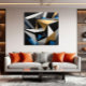 An explosion of geometric colours and contrasting textures. Interconnected triangles create a hypnotic optical illusion, with touches of gold that add a luxurious shine. A work that challenges perception and invites contemplation of the complexity and beauty of forms.
