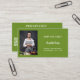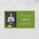 A basil green coloured background. Personalise and add your photo, title, business name/name and text, contact information on front. White text.