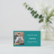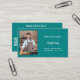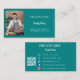 A teal green coloured background. Personalise and add your photo, title, business name/name and text, contact information on front. White text.