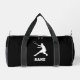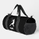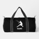 Pro tennis player custom black sports duffle bag. Personalised gifts for tennis players, coach and fans. Add your own personalised text like a funny slogan, quote, joke, saying, monogram or name. Cool sports Birthday present for him. Also great for teams, dad, son, friend, brother, partner etc. Custom colour bags. Forehand pose logo.