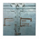Turquoise grey metal door with locks, wheels, text and some torn tape. Photographed in an old building in Wales, edited. By Alexandra Cook aka Linandara.