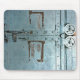 Turquoise grey metal door with locks, wheels, text and some torn tape. Photographed in an old building in Wales, edited. By Alexandra Cook aka Linandara.