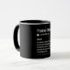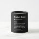 Great product, good delivery time, and an awesome idea for a gift! It was even better than I could have imagined, the customisation is incredible. The colour is perfect, it's dishwashable and microwaveable, the text print on the mug looks exactly like I wanted it to look and best of all, it's a large sized mug that you can drink plenty of coffee or whatever you want! I gifted this to my father and he loves it. He drinks coffee with that mug everyday :) I recommend.