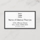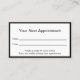 This professional doctor's appointment card is double-sided. Both sides have an elegant black border. Side one says "Your Next Appointment" and has lines for the date and time of the appointment. At the bottom, there's display text you can edit to create a custom message if desired. (Shown: Kindly provide 24 hours notice if unable to keep your appointment.) Side two has a display image that you can replace with your logo. Side two also has display text you can edit to show the doctor's name (or practice name) and its address and phone number. All text can be edited or deleted. The text is black.