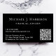 Professional black QR code business card with your name in an elegant white serif font and your title and contact information in simple white typography. Input a URL address to create a scannable digital QR code linked to your website, social media profile, or other platform that showcases your work, allowing customers and clients to explore your expertise. Customise additional text on the back or leave blank.