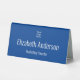 A display image is at the top. You can replace the image with your logo. This deep blue tabletop sign has white display text that you can edit. There are two lines of text on each side. The top line is for the recipient's name. The bottom line is for their professional title or a custom message such as an organisation name.