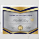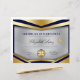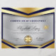 This professional certificate of achievement award features blue and gold, and a grey detailed background. Includes two medal awards: a custom gold and blue medal centred at the bottom with blue stars and a gold medal.