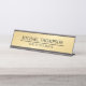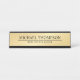 This desk name plate features name and profession in black professional serif font style with black line in the middle on gold background.