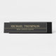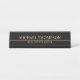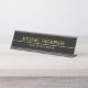 This desk name plate features name and title in gold professional serif font style with gold line in the middle on black background.
