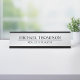 This desk name plate features name and profession in black professional serif font style with black line in the middle on silver background.