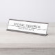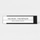 This desk name plate features name and title in black professional serif font style with black line in the middle on white background.