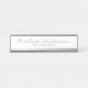 Professional Elegant White and Silver Desk Nameplate featuring name in silver modern script font style and profession in silver classic serif font style, with bottom silver border, on white background.