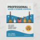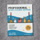 A professional house cleaning services flyer design in blue and yellow tones, with cleaning equipment illustrations (brooms, bucket and spray bottles), a special offer sign, and stars to emphasize cleanliness.