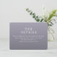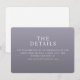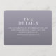 This wedding enclosure card features a minimalist design with a solid lavender background, creating an elegant and modern aesthetic. The layout is clean and centered, utilizing a sans-serif font for a contemporary feel. The typography guides the eye smoothly from the bold title "THE DETAILS" to the informative text below, ensuring clarity and focus on essential information. Its professional yet inviting tone makes it perfect for directing guests to further details about the wedding online.
