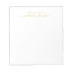 Professional Modern notepad featuring name in gold modern script font style with custom text in gold modern sans serif font style on white background.