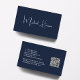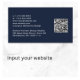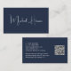 Professional minimal modern dark blue business card with your name in a stylish white signature script on the front and your contact information (such as email, telephone numbers, firm name, social media id's and mailing address) in clean, simple white typography on the back. On the back, personalise with your contact information and add a url address to create a scannable QR Code connected to your website, portfolio, social media profile, or any other platform that showcases your work, making it easy for customers and clients to explore your expertise.
