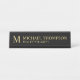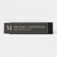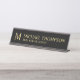 This desk name plate features monogram with name and title in gold professional serif font style on black background.