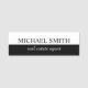 This name tag features name in black professional serif font style and title in black classic script font style on white background.