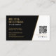 This modern business card features a black background on both sides with a mix of white and gold fonts for a clean, polished look. Gold line accents add a touch of sophistication, keeping the design sharp and professional. The front includes your photo, logo, name, and title for a personalised layout. The back displays your contact details, a scannable QR code, and social media icons with a simple “Connect with us!” message. Fully customisable and easy to match to any brand style.