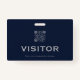 Keep your visitors and guests easily identified with this simple customisable QR visitor badge. The blue and grey design features space to upload your QR code and text that reads "Visitor" in a classic font. The QR code makes it easy for guests to access important information about your facility or event. The text at the bottom reminds visitors to please return the badge before leaving. This badge is perfect for businesses, hospitals, schools, museums, attractions, and more.
