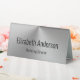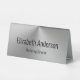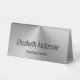 This faux (not foil) silver tabletop sign has black display text that you can edit. There are two lines of text on each side. The top line is for the recipient's name. The bottom line is for their professional title or a custom message such as an organisation name.