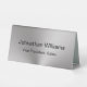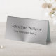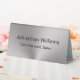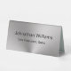 This silver tabletop sign has black display text that you can edit. There are two lines of text on each side. The top line is for the recipient's name. The bottom line is for their professional title or a custom message such as an organisation name.