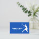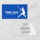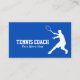 Professional Tennis Coach business card template. Custom visit cards with silhouette watermark design. Sports icon with modern typography for name and slogan. Blue or custom colour background. Pro businesscards for tennis jobs, work, player, fan and fitness coach. Available in different sizes, paper thickness and round corner cut out shape. Change quantity to get the cheap bulk pack price. Personal cards for club trainer, academy teacher, personal instructor, hitting partner, assitant, shop, sports store, stringer, sparring partner, business owner, free self employed worker, company boss, co workers, staff, personnel, lead manager, tennis court builder, employees, volunteers, advisor, umpire, mum, dad etc. Printed on both sides.